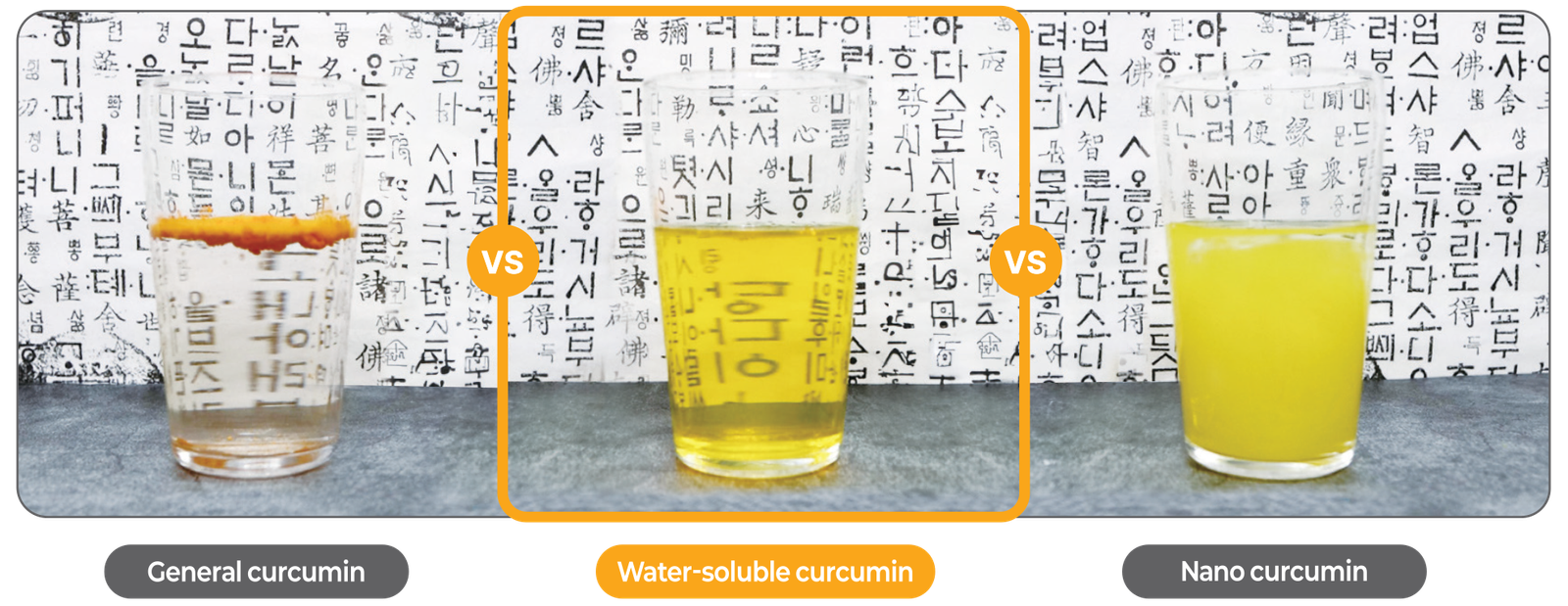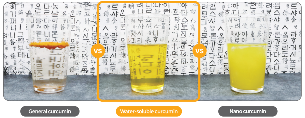 Kurkumin yang larut dalam air tidak dihancurkan secara fisik atau didispresikan, tetapi benar-benar larut dalam air melalui teknologi paten larut air untuk memaksimalkan penyerapan dalam tubuh.